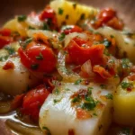 Quando ero bambina, il sabato significava cucina piena di profumi: il sugo che sobbolliva, le patate che profumavano di terra e, immancabilmente, il baccalà che mia nonna preparava con affetto. Ancora oggi, ogni volta che preparo il baccalà con patate sento quella stessa calda sensazione di casa (e un piccolo tuffo nello stomaco dall’emozione). Questa ricetta semplice e rustica è uno di quei piatti che raccontano storie: sapori genuini, olio EVO, pomodorini dolci e tanto amore.