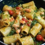 C’è un piccolo rito in ogni casa italiana: tornare dal lavoro, aprire la finestra e sentire il profumo del sugo che sobbolle o dell’erba fresca tagliata. I miei Paccheri Rigati con Pesto di Rucola e Gamberetti sono nati proprio da uno di quei pomeriggi — voglia di mare, poco tempo e il desiderio di qualcosa di confortante ma luminoso. Paccheri Rigati con Pesto di Rucola e Gamberetti combina la consistenza piena della pasta rigata con la cremosità del pesto di rucola e la dolcezza salata dei gamberetti: perfetto per una cena dopo il lavoro, un pranzo della domenica o una serata d’inverno che vuole farsi elegante. Se cerchi ispirazione per una versione casalinga e autentica, prova anche questa variante tradizionale e saporita: Paccheri rigati di Gragnano con pesto di rucola, pomodorini, noci e gamberetti.